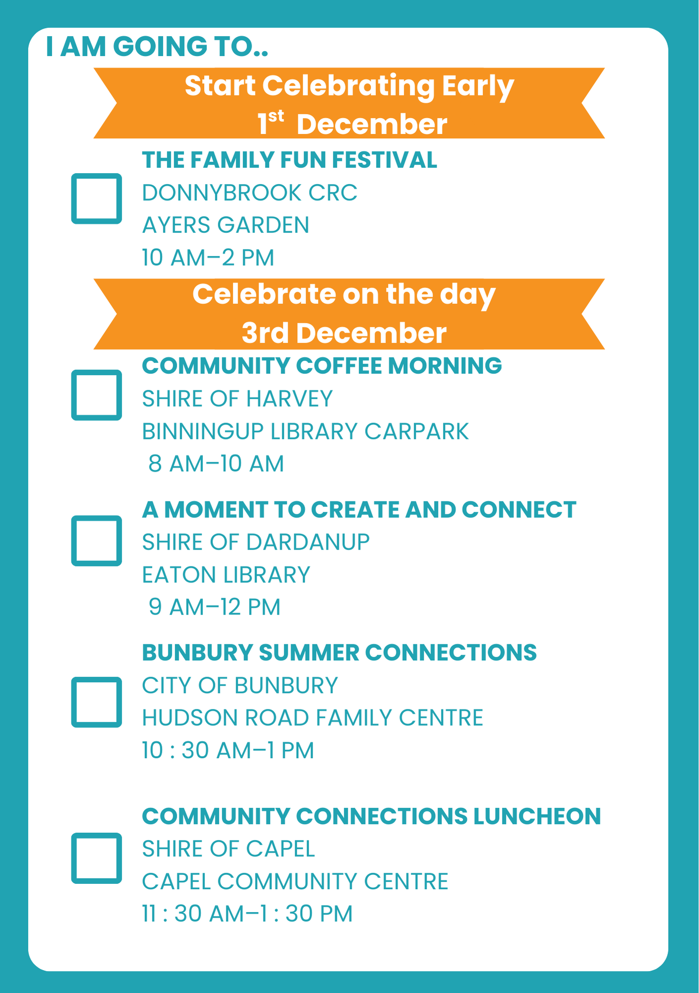 This year, we are celebrating alongside many wonderful events across the Bunbury Geographe region. Local groups, services, and community champions are hosting activities that highlight accessibility, participation, and connection. Whether you enjoy markets, workshops, arts, performances, or community gatherings, there is something for everyone.